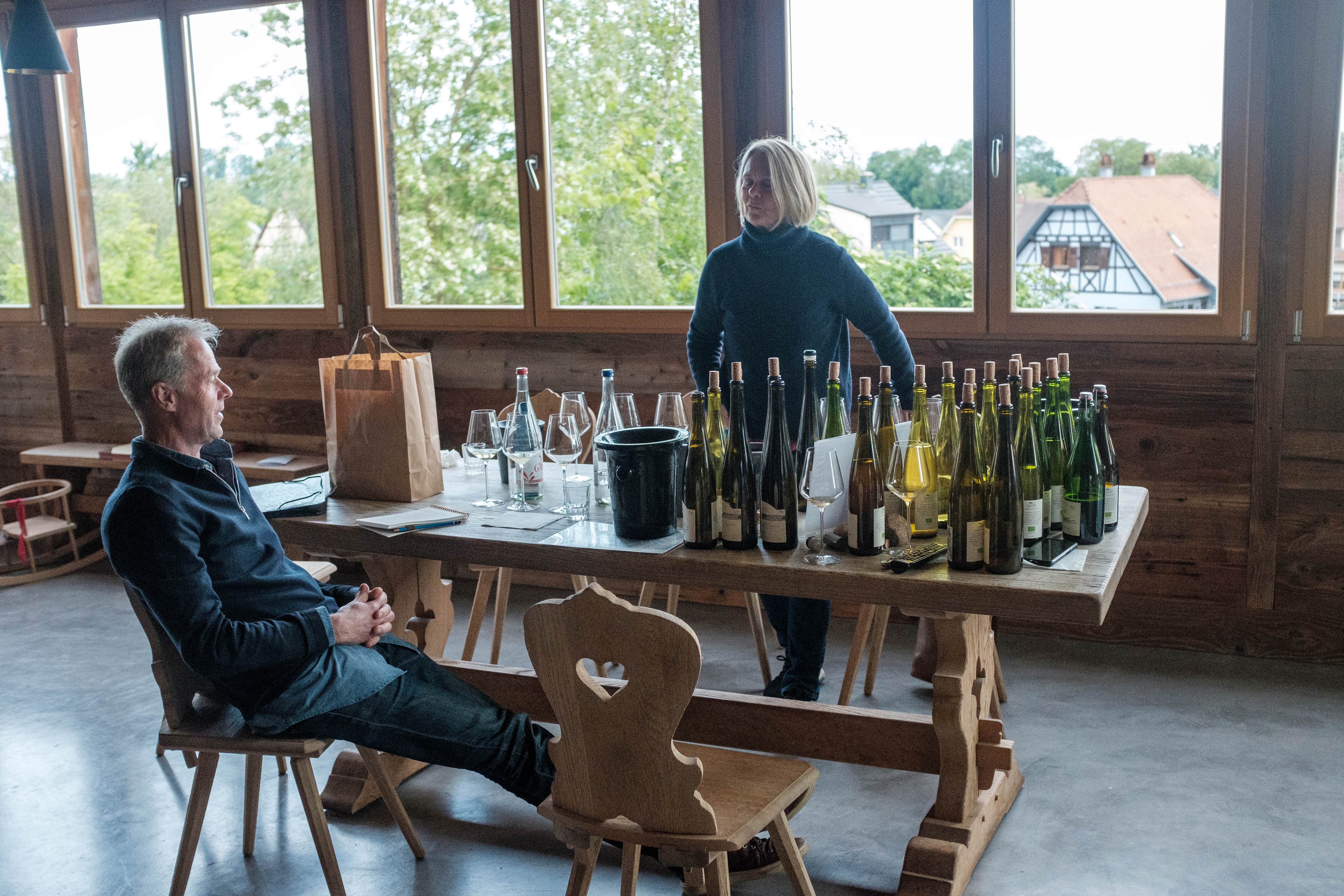 Luc och Myriam tog emot oss i solen på gårdsplanen. Vi fick oss till livs både hur Lucs familj flyttat från nuvarande Tyskland på 1800 talet, varit garvare och nu med olika efternamn är vin odlare, hotelägare och restauratörer i byn; alla är kusiner! Myriam kommer från västkusten med fiskare i släkten men flyttade när hon träffat Luc till Itterswiller och snabbpluggade vinkunskap och engagerade sig i gården. Byggnader rustades upp och odlingen ställts om till ekologiskt men det har vi skrivit om tidigare. Nästa generation går på vinskola med biodynamisk inriktning. Inga större väderkatastrofer i år verkar det som, snarare tvärt om. Så här långt har det varit stabila förutsättningar; Soligt i början av året, regn under sex veckor och nu friskt men klart -efter 25:e maj är frostrisken över enligt sägnen.