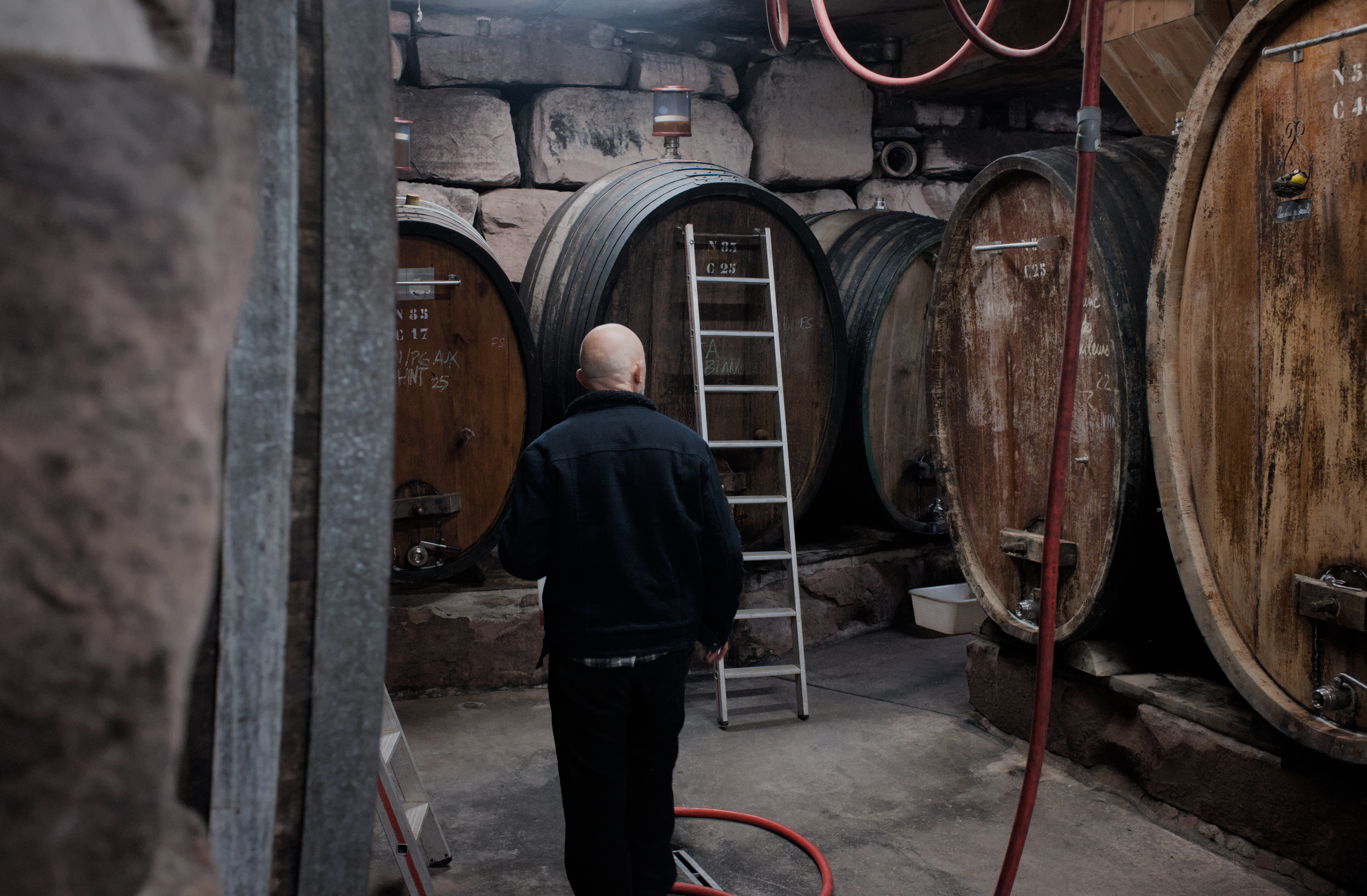 Det är en bit att åka upp till Woxheim som ligger några mil utanför Strasbourg. på Lissner gården var Theo fullt upptagen med att buteljera det första vinet på årgång 2025. 2024 gav väldigt liten skörd och vinet var slut och kunderna ropade, då får man prioritera. Bruno tog emot oss och berättade att 2024 gett kanske en tredjedel av en normal skörd. Det hade varit en blöt säsong och hela den normala årsnederbörden kom under en månad. Årgång 2025 var bra och den låg nu i källaren. Vi testades med att förstå jordmånens påverkan på vinet. Samma druva på en rik jordmån och en mager. När vinrankan har ett lätt jobb att mogna sina druvor ell får kämpa. Vi klarade oss utan att få körförbud och togs med till källaren för ytterligare provning direkt ur fat och ståltankar. Fantastiska smaker, intensiva, mineraliska, salta, zestiga, fruktiga ja ni som smakat vet! Otroliga viner!! Bruno visade lite bilder från skörden, i vinfält fulla av örter och blommor, en dröm-djungel med druvor som liknar oslipade ädelstenar. Varje vinranka bär precis då mycket vindruvor som den orkar med att mogna. Skalet, juicen, kärnorna, ja till och med stjälkarna är perfekt mogna när det ska skördas. Och kvaliteten på vinet... helt unik. Det är en bit kvar till den nya årgången skall buteljeras men vi är hyfsat väl beställd på 2023:or, så vi klarar att vänta.