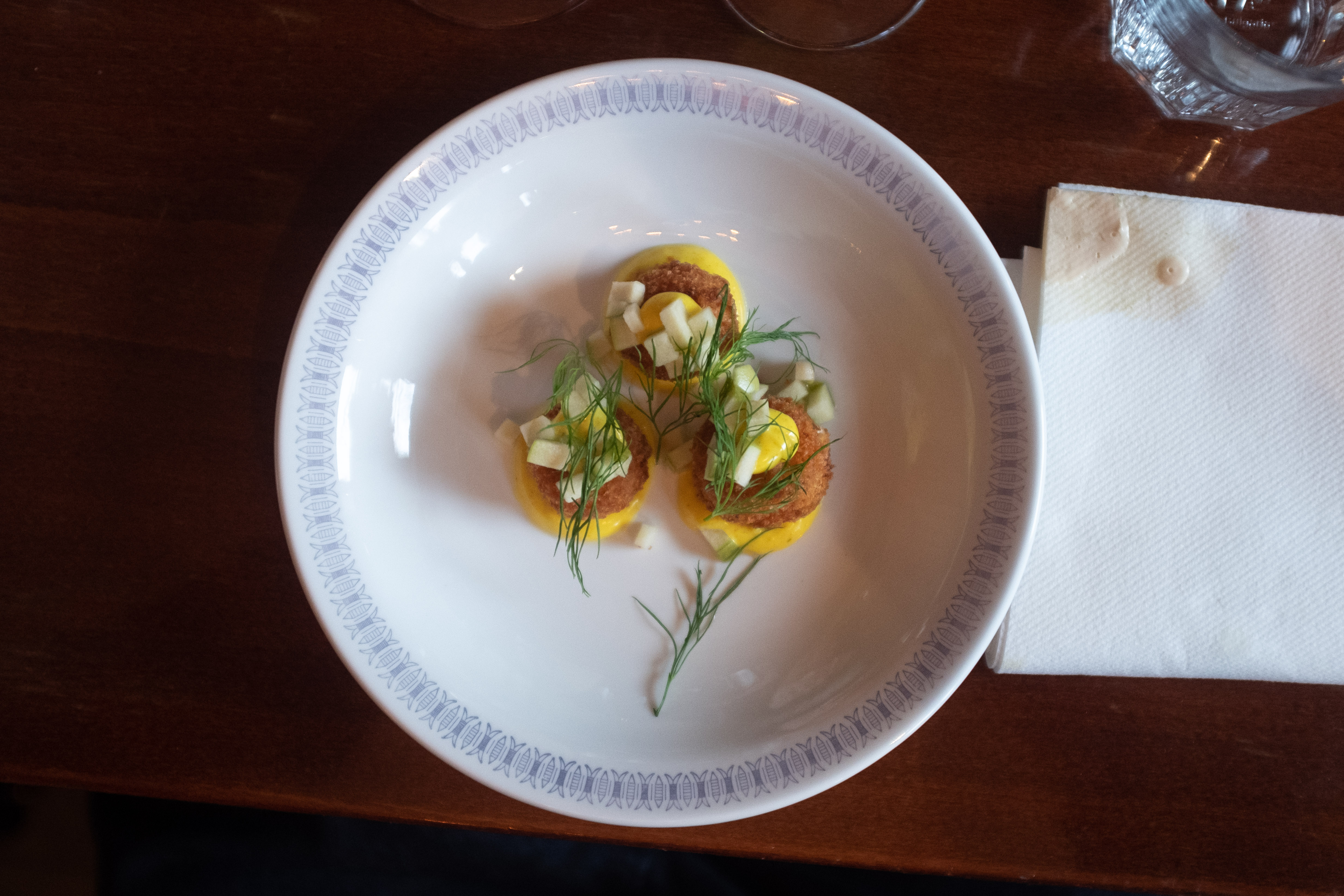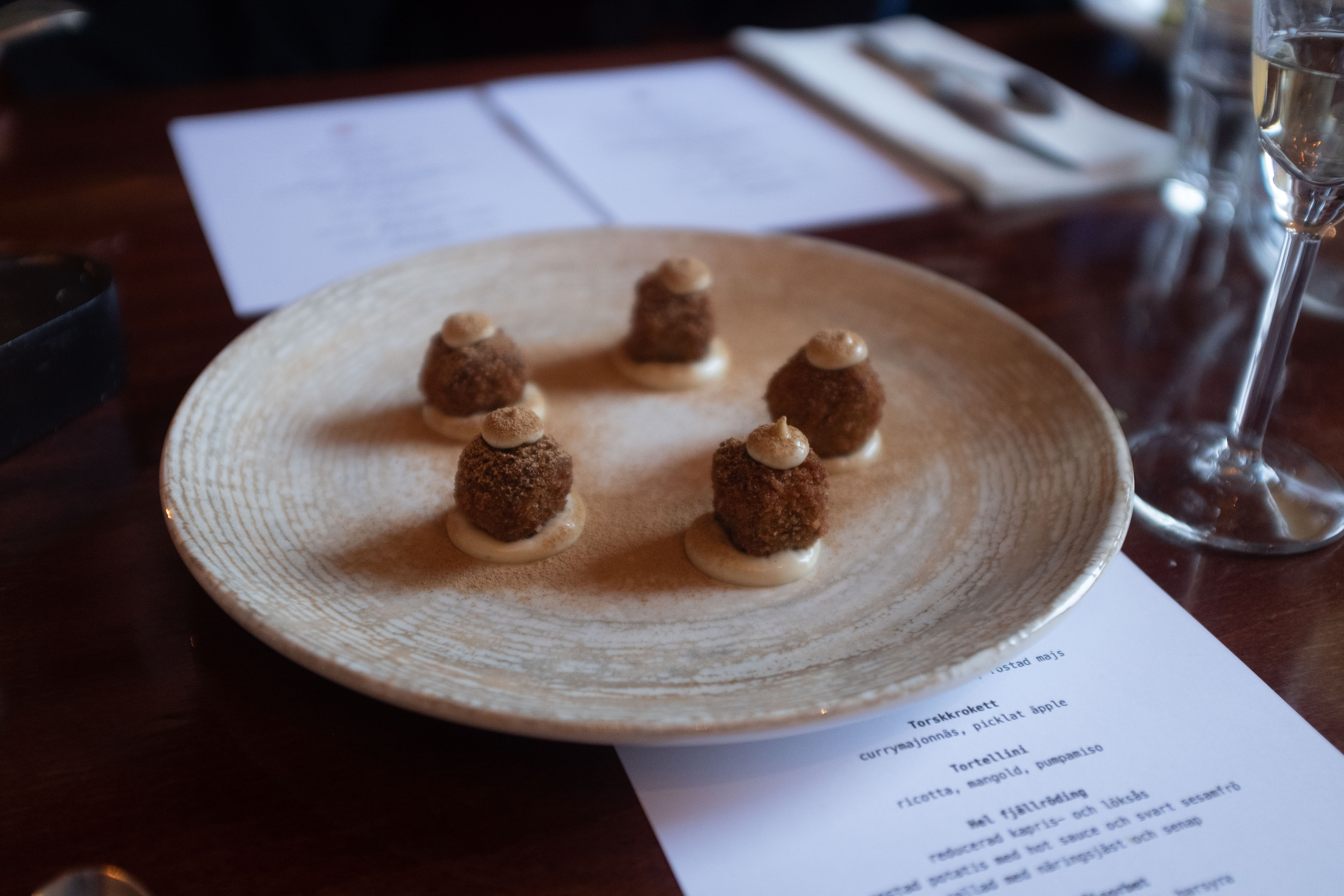 (F) Torsk krokett med curry majonnäs och picklat äpple.